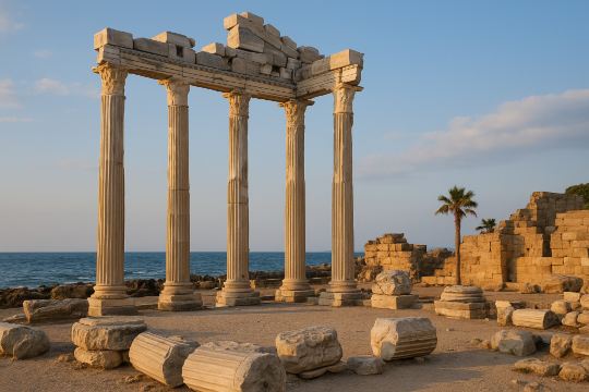 ▲ 阿波罗神庙位于海边,遗迹以几根立柱与石基为主要结构。海风和光线使场景氛围柔和,适合散步与拍照。现场可以观察柱式比例、纹理与石材结构,了解当时的宗教建筑形式。景色自然舒适,是本行程中较具特色的一站。