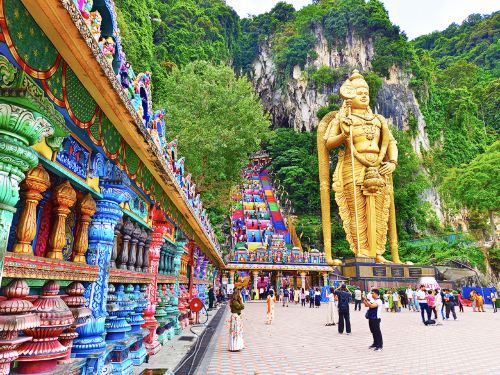 ▲ 黑风洞是一处拥有一系列洞穴与寺庙的石灰岩山丘,也是印度以外的印度教圣地之一。在黑风洞前面矗立着一座巨大的镀金印度大佛战神MURUGAN神塑像,高达百余米。佛像前的广场上有许多鸽子,还可以看到许多印度教的神像及彩绘。在黑风洞的入口便能看到这颇为壮观的七彩阶梯了。走进神庙洞,沿着高耸的洞穴往里走,百余米高的寺庙天花板及装饰精美华丽的印度教神龛令人叹为观止