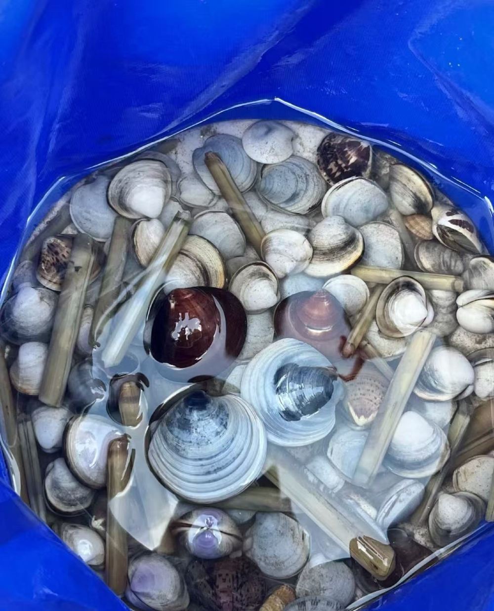▲ 赶海战果!蛤蜊、竹蛏在桶里挤挤挨挨,这是大海给勤劳者的奖励
