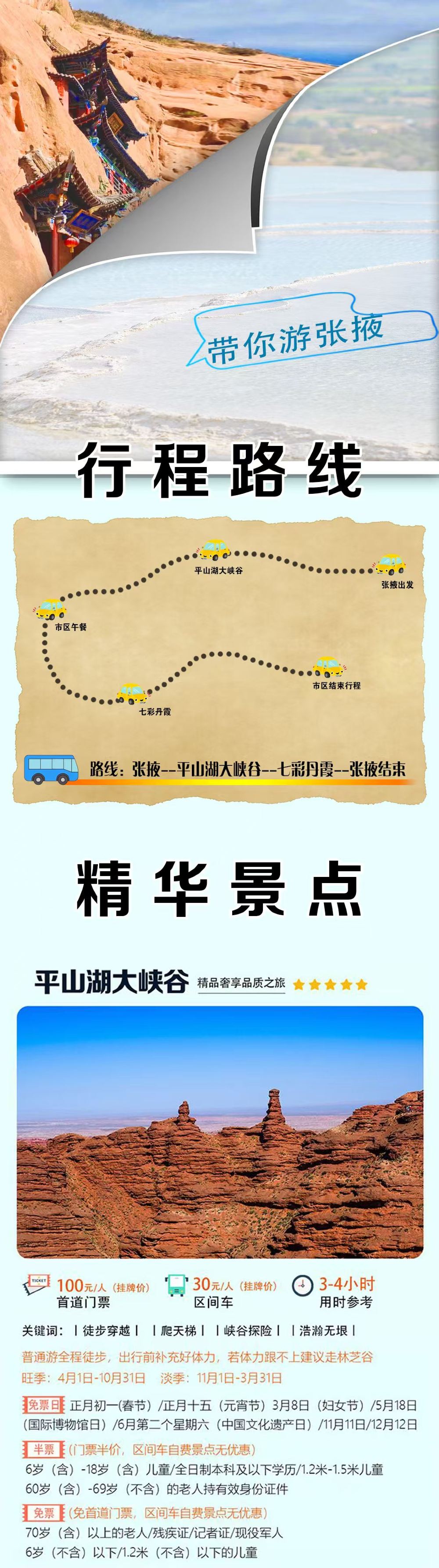- 精华景点一网打尽:一次出行,即可领略张掖平山湖大峡谷的雄浑壮阔与七彩丹霞的梦幻绚丽,感受大自然的鬼斧神工。