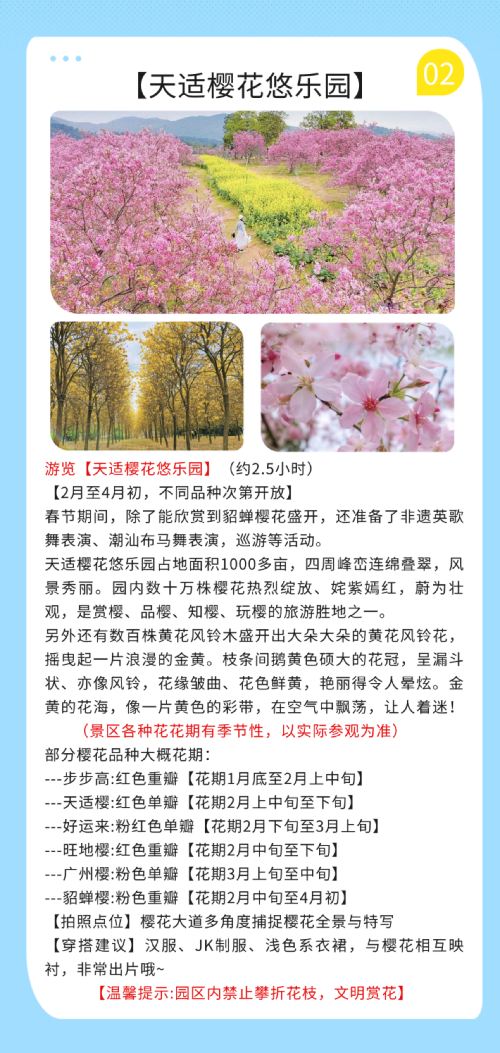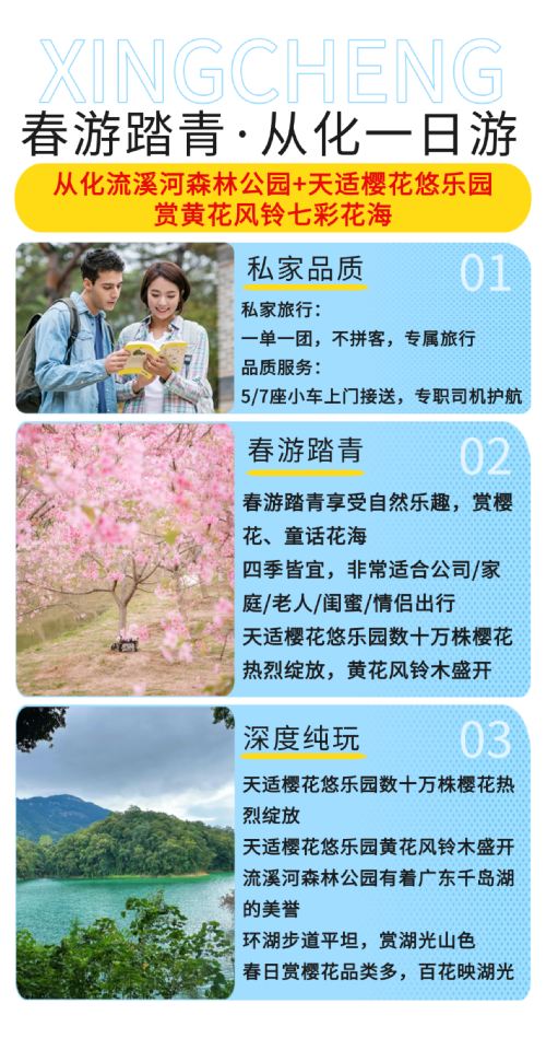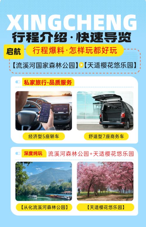 从化流溪河森林公园+天适樱花悠乐园一日游|包车游上门接送【私家旅行:一单一团,不拼客,专属旅行;品质服务:车上门接送,专职司机护航】