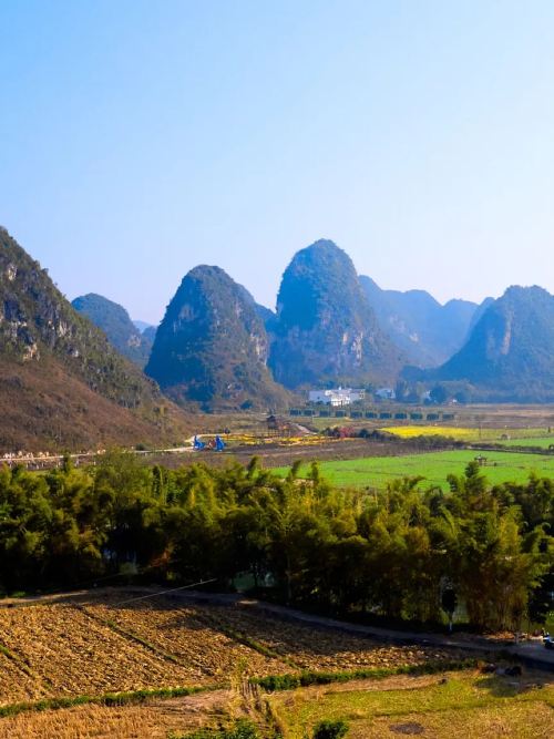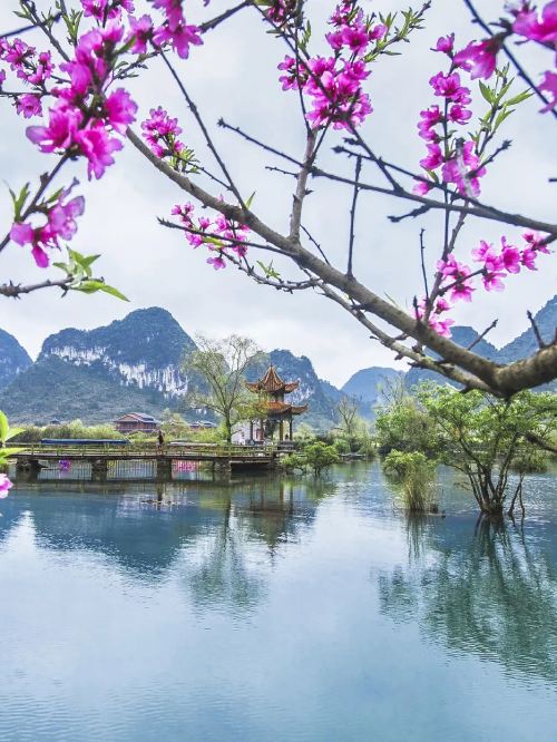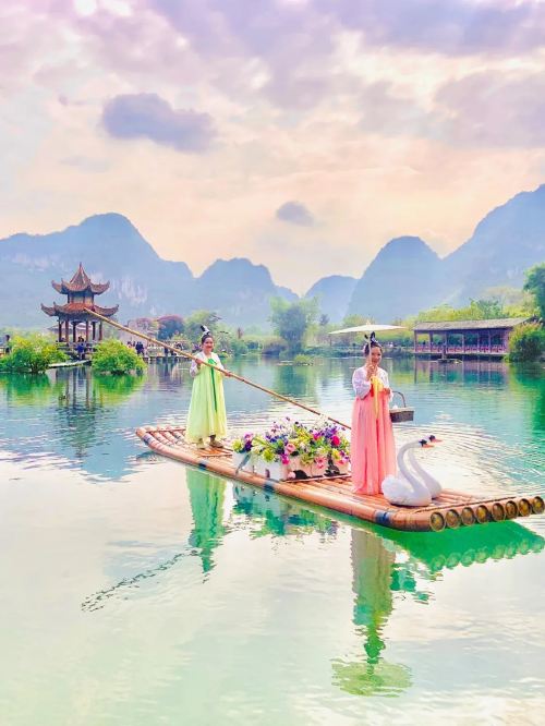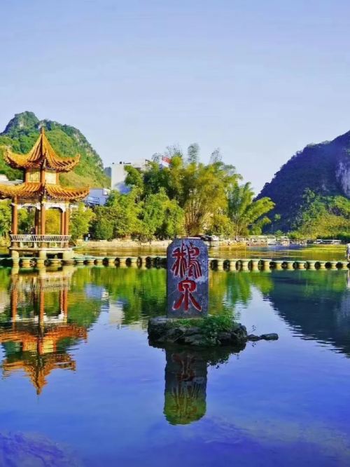 ▲ 鹅泉位于靖西市,自古就是靖西八景之一,绿水青山、亭台楼阁、乡村田园,在这里都可以感受到。“鹅泉跃鲤三层浪”的传说、明代皇帝赐封的“灵泉晚照”古石刻,更是给这里添了一份迷人气息。