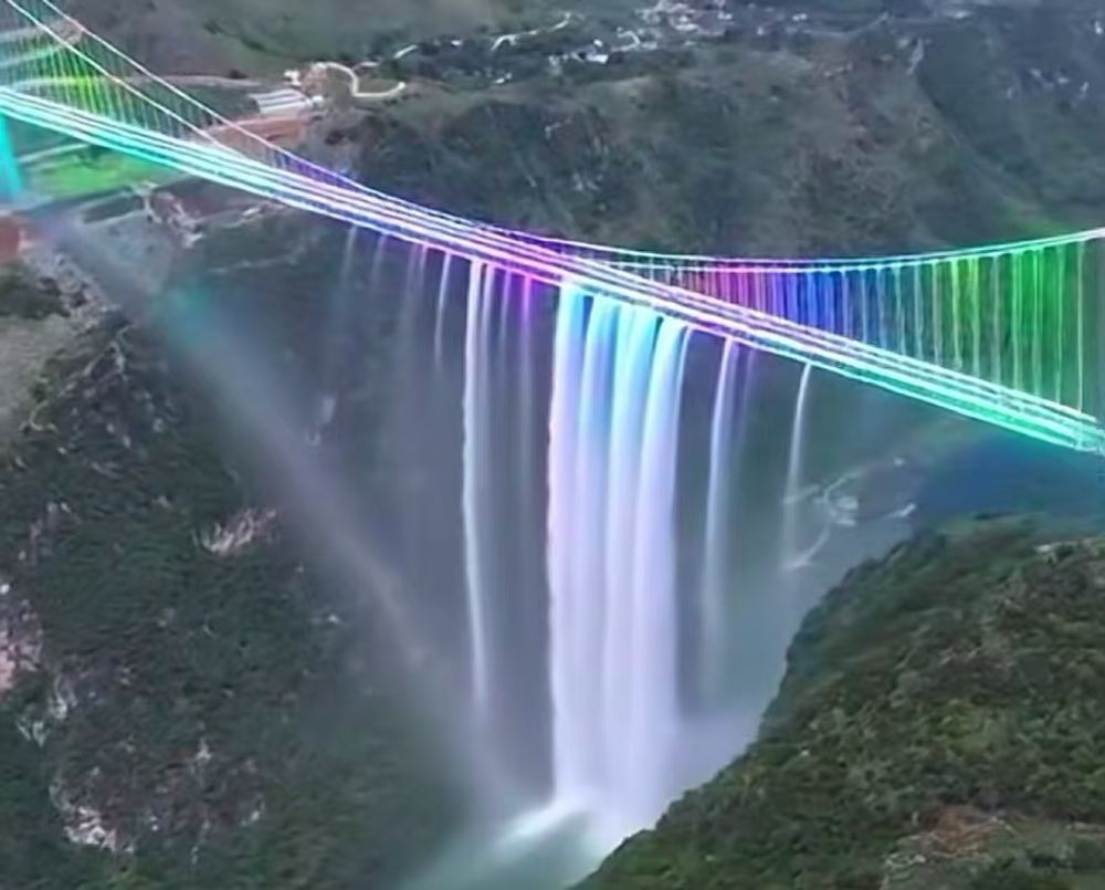 ▲ - 625米高空的“峡谷IMAX”,900个喷头绘就300米高水幕画卷 。 - 光、水、声共舞,在“地球裂缝”上演光影神话 。 - 白天如银河垂落,夜晚化光影舞台,桥与峡谷共赴浪漫。 - 苗绣纹路、建桥史诗映于水幕,一帧帧都是贵州故事。 - 环保岩溶水作墨,高科技为笔,点亮世界高桥的夜。