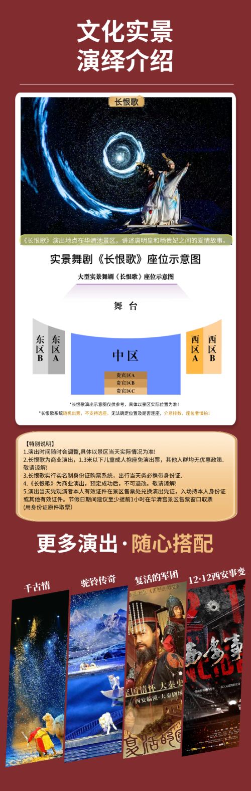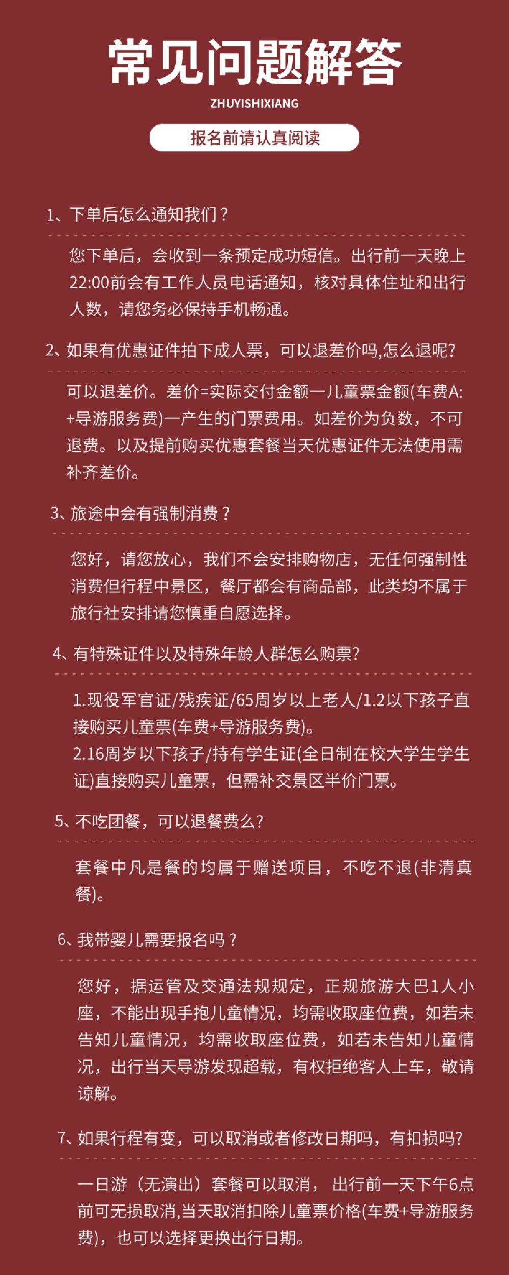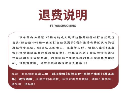 3、演出门票属特殊商品,下单后当天不可退改,除景区通知停演以外,其它任何原因,当天都是不可退票!介意者,请谨慎购买!