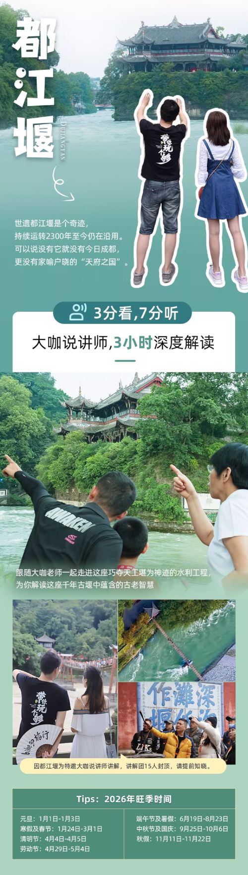 该产品全程使用小车出行,其中都江堰中讲解部分,因特邀大咖老师讲解。都江堰景区内讲解是15人及以内团人数,请下单前提前知晓,介意人数勿拍~