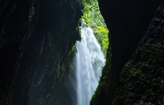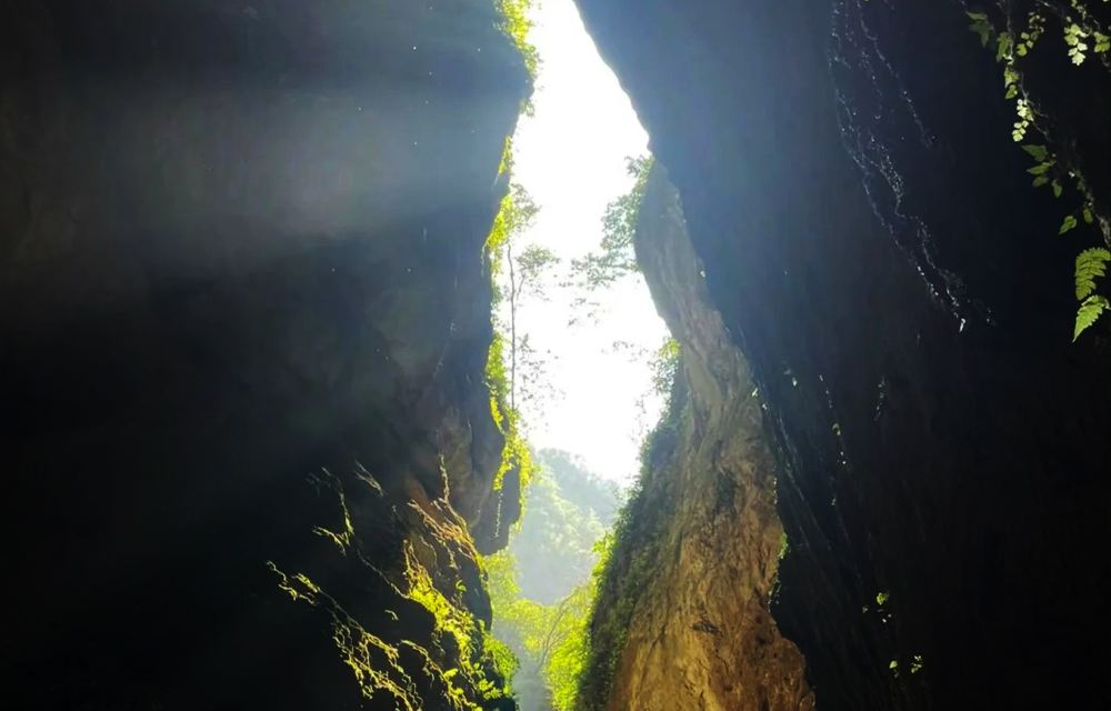 ▲ 地缝中老树藤萝盘绕,泉水流瀑挂壁,险峻幽深,怪石峥嵘,明涧湍急,让人仿佛置身于神秘的地下世界