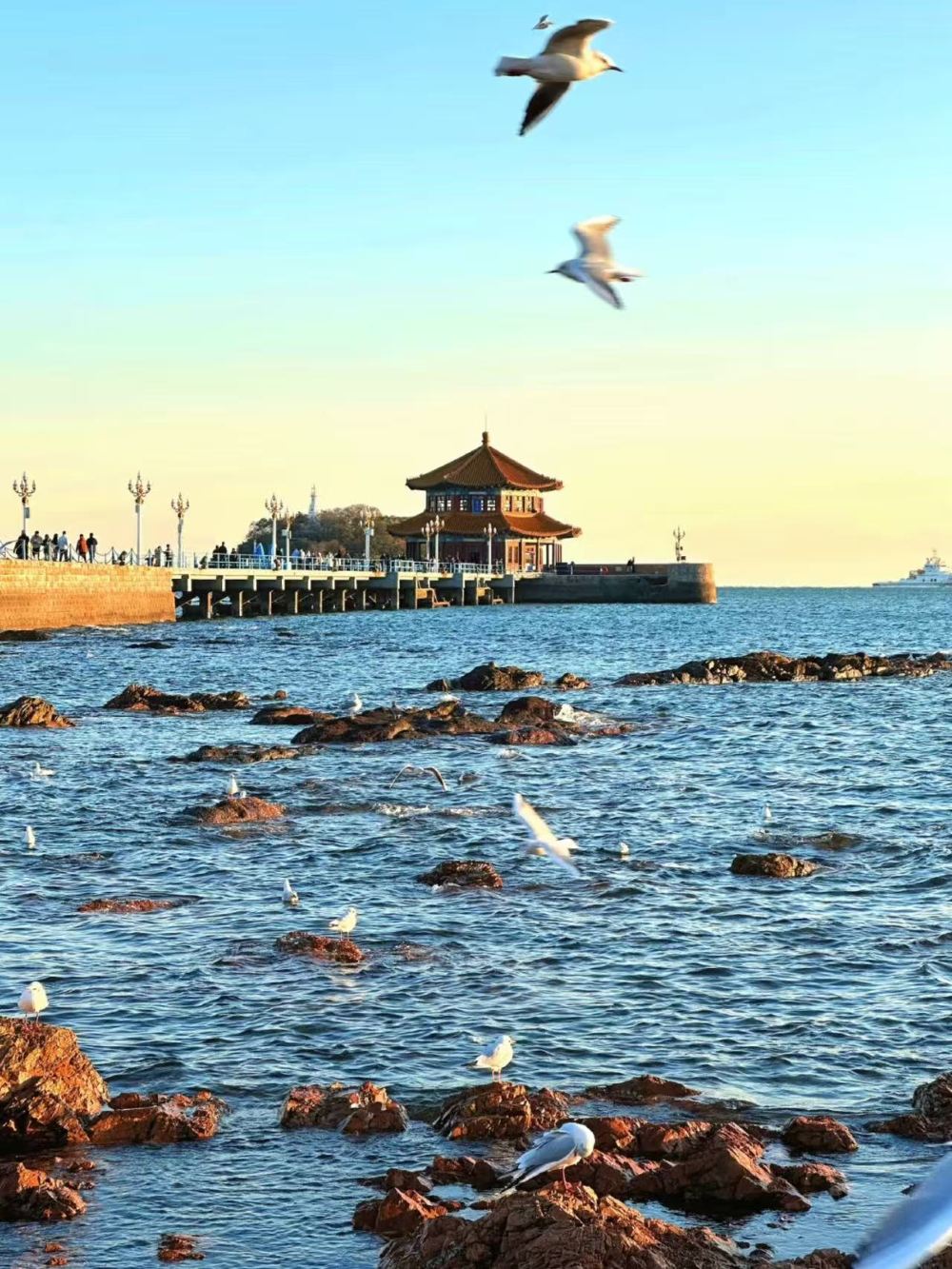 ▲ 栈桥——青岛百年地标,探入碧波的回澜阁与长虹卧波般的桥身,将城市历史与海湾风光凝练成一道“碧海蓝天间的超美长廊”。