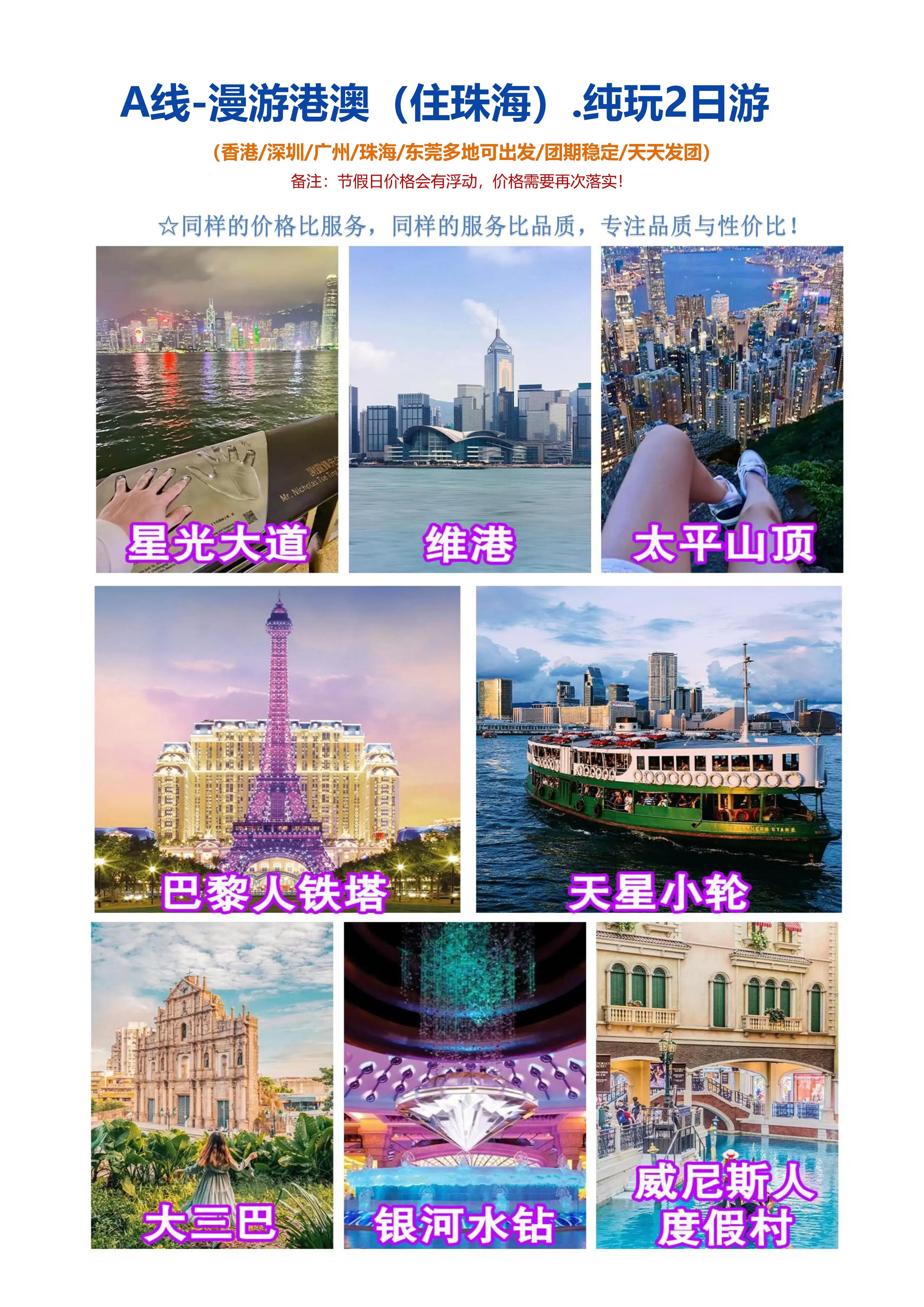 漫游香港+澳门纯玩2天1晚丨住3钻/4钻级别酒店【送上网卡+保险+2正餐丨车观港珠澳大桥,深圳出发】
