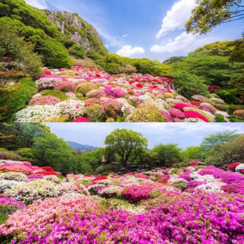 ▲ 御船山乐园-广阔的园内尽植数十万株花木,四季景色各异,初春大岛樱,山樱,八重樱等约2000棵樱花树相继开花, 秋季的枫红以在庭园内蔓延开来的层层叠叠的红色、橙色与黄色,将御船山环绕,目所及之处尽是如锦缎般美丽色彩。 御船山乐园的看点主要是,呈研钵状的“杜鹃谷”。色彩斑斓的杜鹃花争奇斗艳,如同是铺在地面的地毯一般,那景色令人陶醉,深受游客好评的赏花台,就设置在御船山的左侧,被树林包围的散步道的深处。自4月下旬起至5月上旬迎来最佳观赏期。