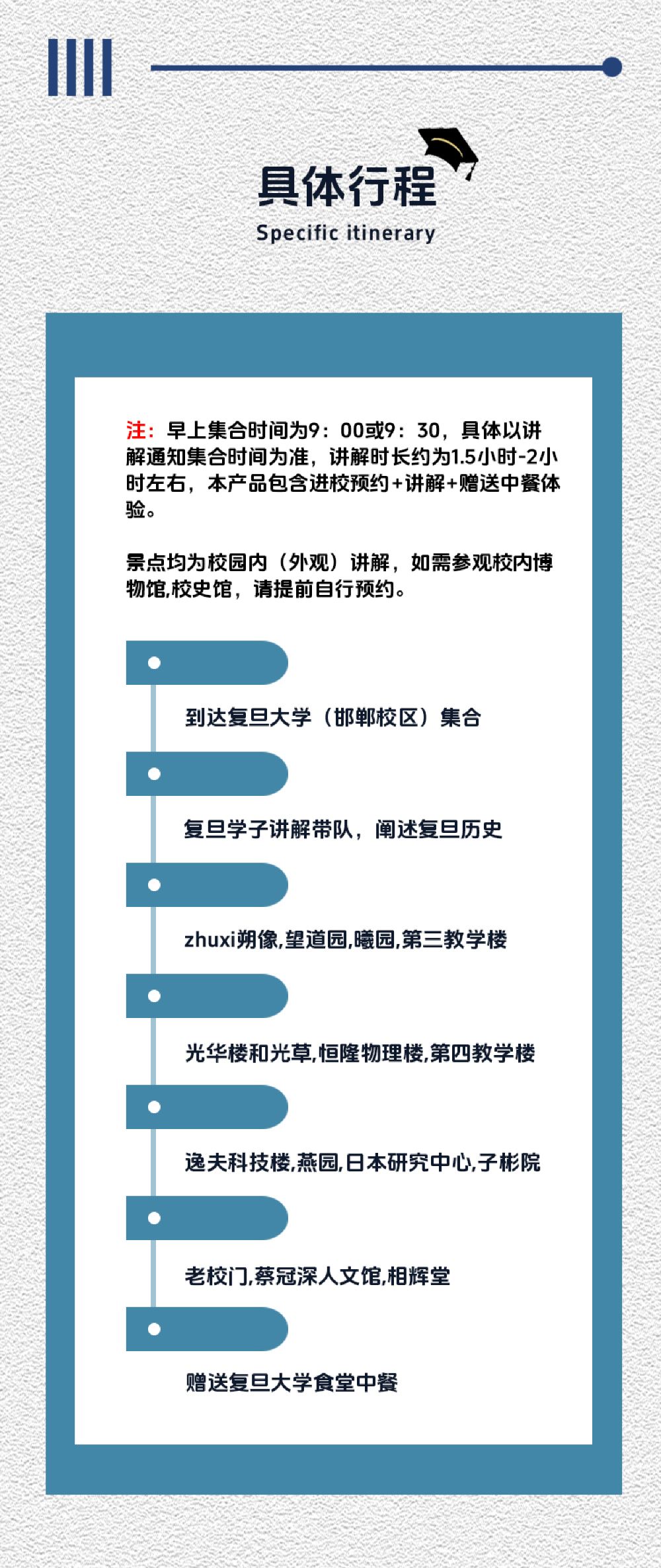 注:早上集合时间为9:00或9:30,具体以讲解通知集合时间为准,讲解时长约为1.5小时-2小时左右,本产品包含进校预约+讲解+赠送中餐体验。