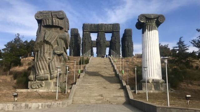 ▲ 格鲁吉亚编年史碑,又称“苏维埃巨石阵”,位于第比利斯西北郊。它由16根高35米的青铜柱组成,是为纪念格鲁吉亚建国3000周年和基督教传播2000周年而建。每根柱子分三层,记载着圣经故事、格鲁吉亚重要人物及传统节庆等,由艺术家朱拉布·切尔塔瓦设计,1985年开工,是格鲁吉亚历史文化的象征。