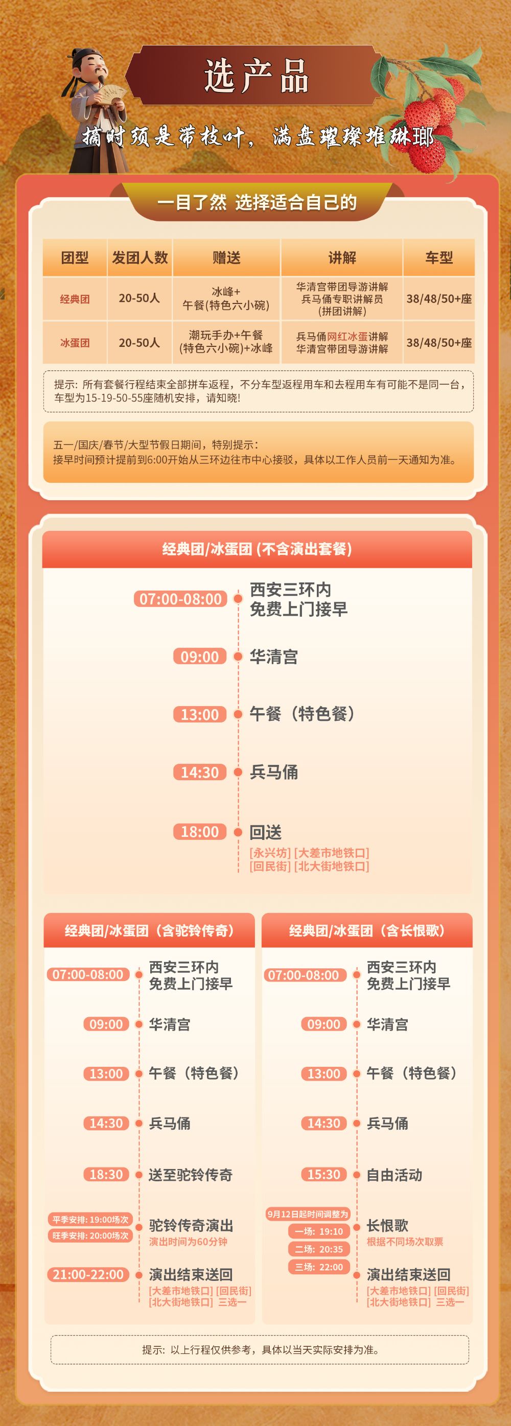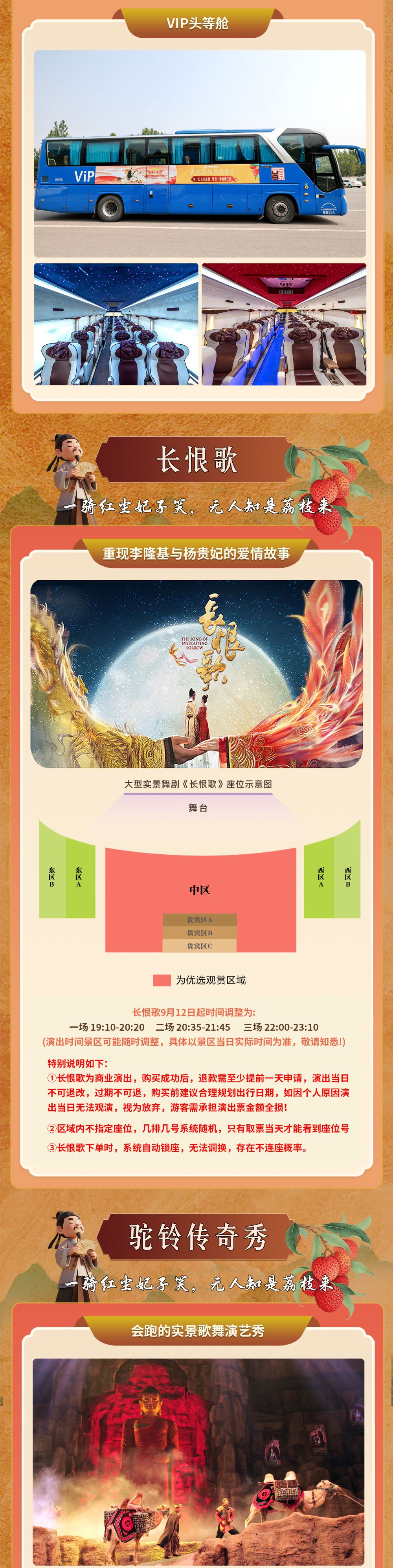 ④2025年自9月1日起,《长恨歌》演出时间:第一场:19:10-20:20,第二场:20:35-21:45,第三场:22:00-23:10,演出时间约1小时10分左右(演出时间景区可能随时调整,具体以景区当日实际时间为准,敬请知悉!)