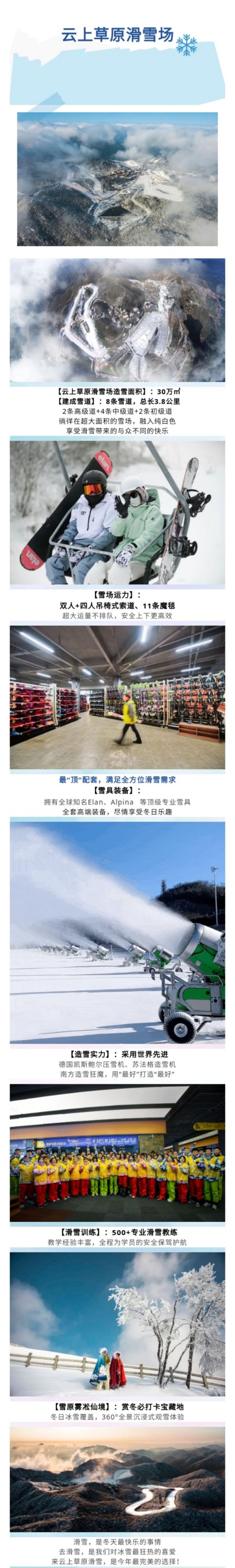 配套体验多元,度假感十足滑雪场隶属于云上草原度假区,并非单一滑雪场地。除滑雪外,度假区内还有悬崖秋千群、天空之阶、水晶廊桥等 30 多个悬崖游乐项目,滑雪之余可体验极限户外乐趣。住宿方面有半山隐竹等特色酒店,部分酒店配有专属索道,出行十分便捷;更有藏于竹林的洞穴温汤,滑雪后泡温泉能缓解疲劳,尽享 “冰火两重天” 的体验。同时这里还有华东规模较大的多功能滑雪服务大厅,餐饮、装备租赁等服务一应俱全,能满足游客一站式度假需求。