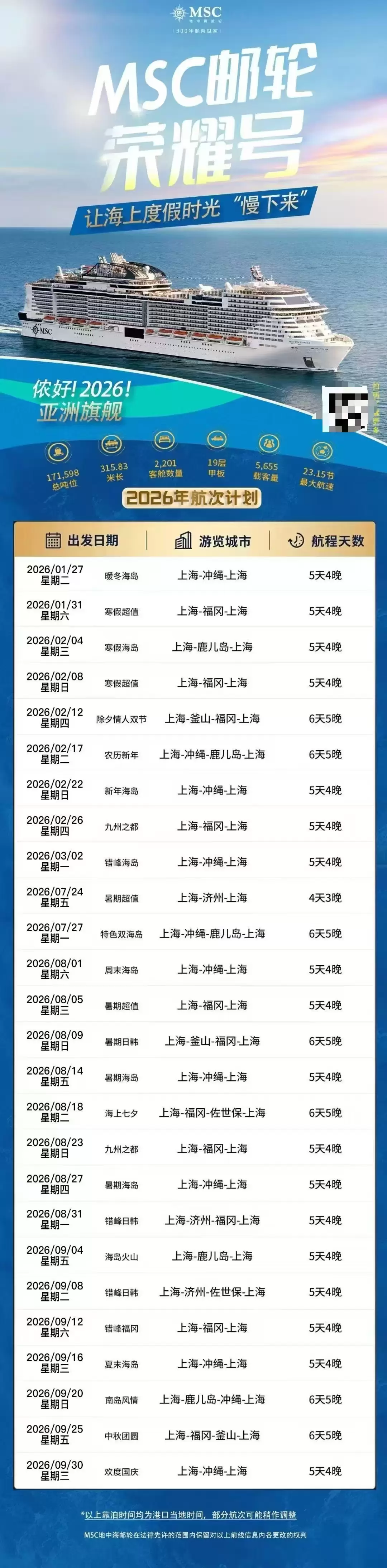 春节大卖亚洲旗舰·MSC地中海·荣耀号 豪华邮轮 2026 上海出发