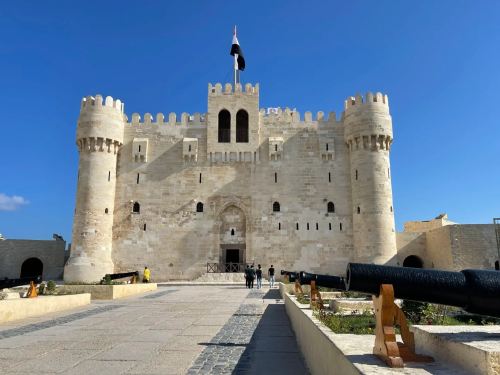 ▲ 城堡建于1477年,由马穆鲁克苏丹凯特贝为抵御奥斯曼入侵,以拆毁的古代灯塔废墟为建材建成。城堡呈三角防御布局,三面高墙设半圆塔楼,主塔为三层堡垒,入口饰玫瑰色花岗岩与苏丹铭文,内部含清真寺、兵营及箭孔瞭望口。
