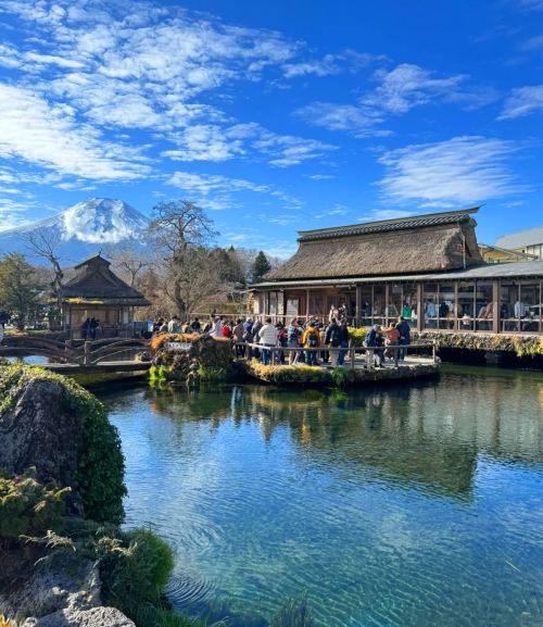 ▲ 忍野八海是由富士山雪水汇成的八口泉池,池水清澈,鱼儿畅游。周围环绕着传统日式茅草屋与小桥流水,风景如画。