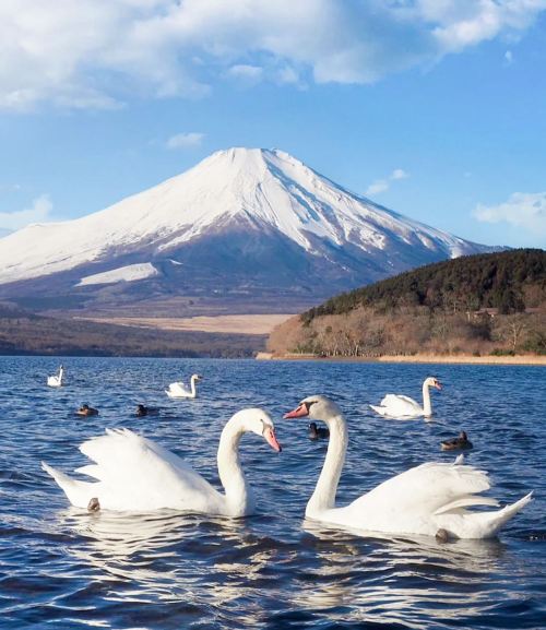 ▲ 在山中湖碧波之上,优雅天鹅与富士山相映成趣,尽享自然秘境的宁静与壮丽。
