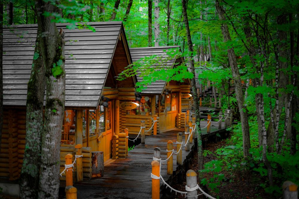 ▲ 【森林精灵露台】森林精灵的露台(Ninguru Terrace)为作家仓本聪所设计的森林游步道,茂密树木环绕的森林中,聚集着15家风格各异的圆木建筑手工艺品商铺。 木屋商铺里贩售的是别无二家的商品,其中以手工艺品为主,包括许多以自然为主题的杂货和饰物,极具富良野特色。