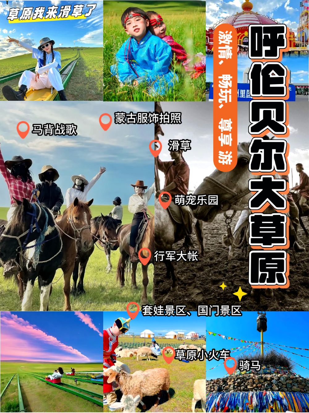 ▲ 坐进滑草车,顺着 30°的绿毯直冲向下,青草香撞进鼻腔,眼前风景糊成流动的油画;之后我们前往成吉思汗专属行军大帐,前往草原深处,感受游牧人家带给我们的蒙古文化,品尝蒙古族手工白食(牛奶,奶茶,酸奶,)穿着雍容华丽的蒙古服饰,体验草原那达慕主要活动项目蒙古族射箭,小朋友参与草原五畜的成长过程——喂小羊,还有更多蒙古族文化和游乐项目,蒙古粘画,皮画展示,原始蒙古包拍照打卡,去到草原深处体验蒙古族的原生态的演绎,在萌宠乐园与草原上的小动物们亲密接触;
