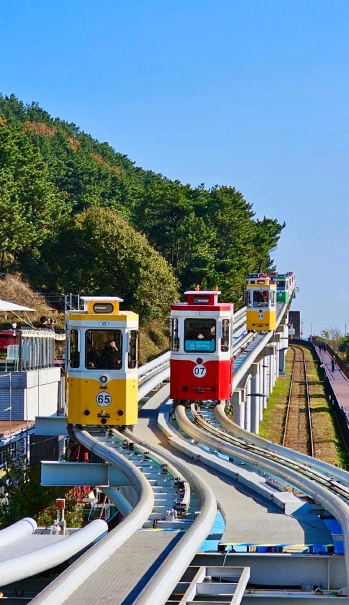 彩色胶囊列车和蓝天白云,仿佛置身于宫崎骏的动漫里啦宝子们收好这份攻略,开启一场浪漫的海滨之旅吧