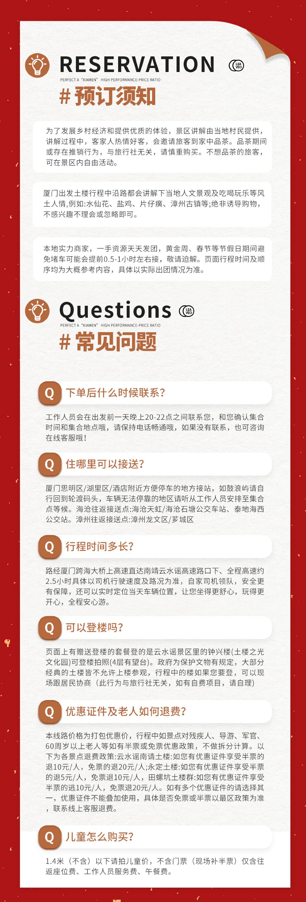 所有土楼线路法定节假日(包括元旦、春节、清明节、劳动节、端午节、中秋节、国庆节)等特殊日期一经预订成功不可退改,由于接待量比较大景区会出现拥堵情况需耐心等待,无费用赔偿。部分出游车上可能会出现没有工作人员,只含当地景区讲解。18人小团人数无上限,可能会出现单双线拼车的情况。
