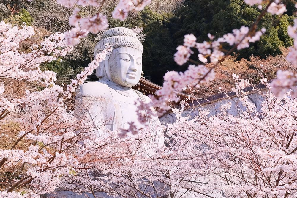 ▲ 壶坂寺 (南法华寺):一座建于公元703年的千年古刹。樱花季节,寺前庄严的佛像与周围柔美的粉色花海相映,别具意境。这里是行程中感受宁静春日氛围的一站。