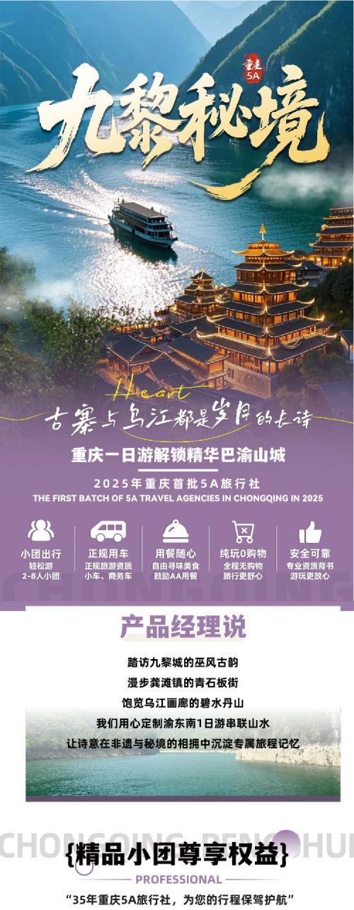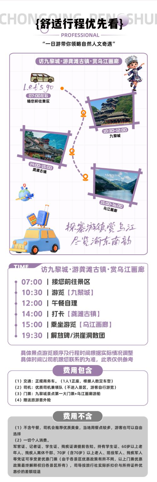 重庆九黎城+龚滩古镇+乌江画廊游船一日游【2-8人团】【[专业保障]专业保障安心无忧,正规资质营运。主城多区上门接,安全与舒适贯穿全程。】
