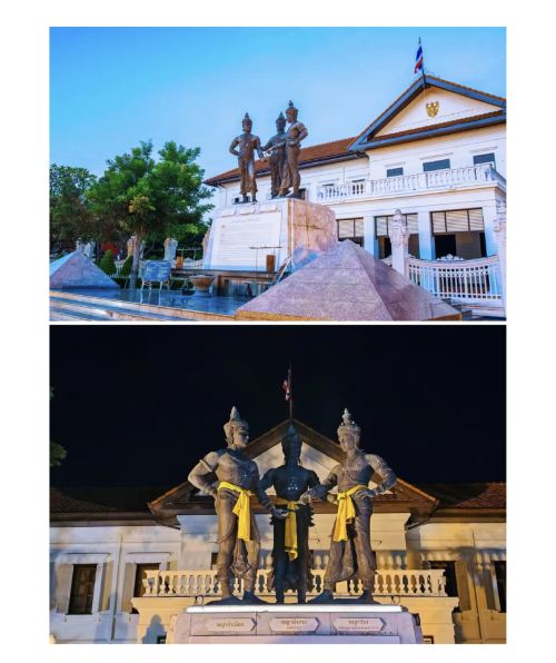 这个广场在清迈古城的中心,是清迈市立艺术文化中心外面的广场。三王纪念碑 是纪念三位对清迈有重大贡献的人物——兰甘亨大帝、孟莱王和南蒙王