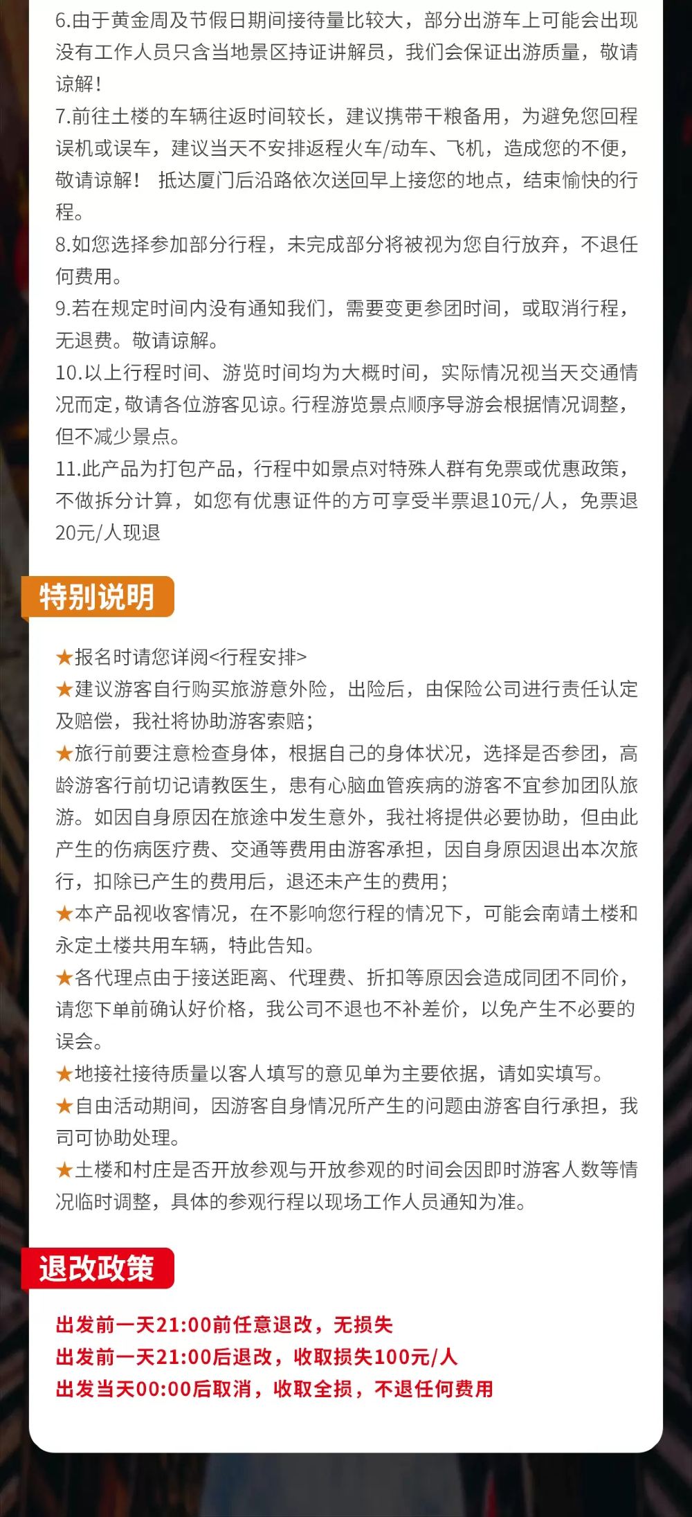 3、前往土楼的车辆往返时间较长,建议携带干粮备用,为避免您回程误机或误车,建议当天不安排返程火车/动车、飞机,造成您的不便,敬请谅解!如因误车或误机所产生费用需自行承担,旅行社概不负责。 如因个人原因需要变更参团时间,或取消行程,无退费,敬请谅解。若因恶劣天气、景区限流等不可控因素导致无法出行,将全额退款给您,无损失赔偿。