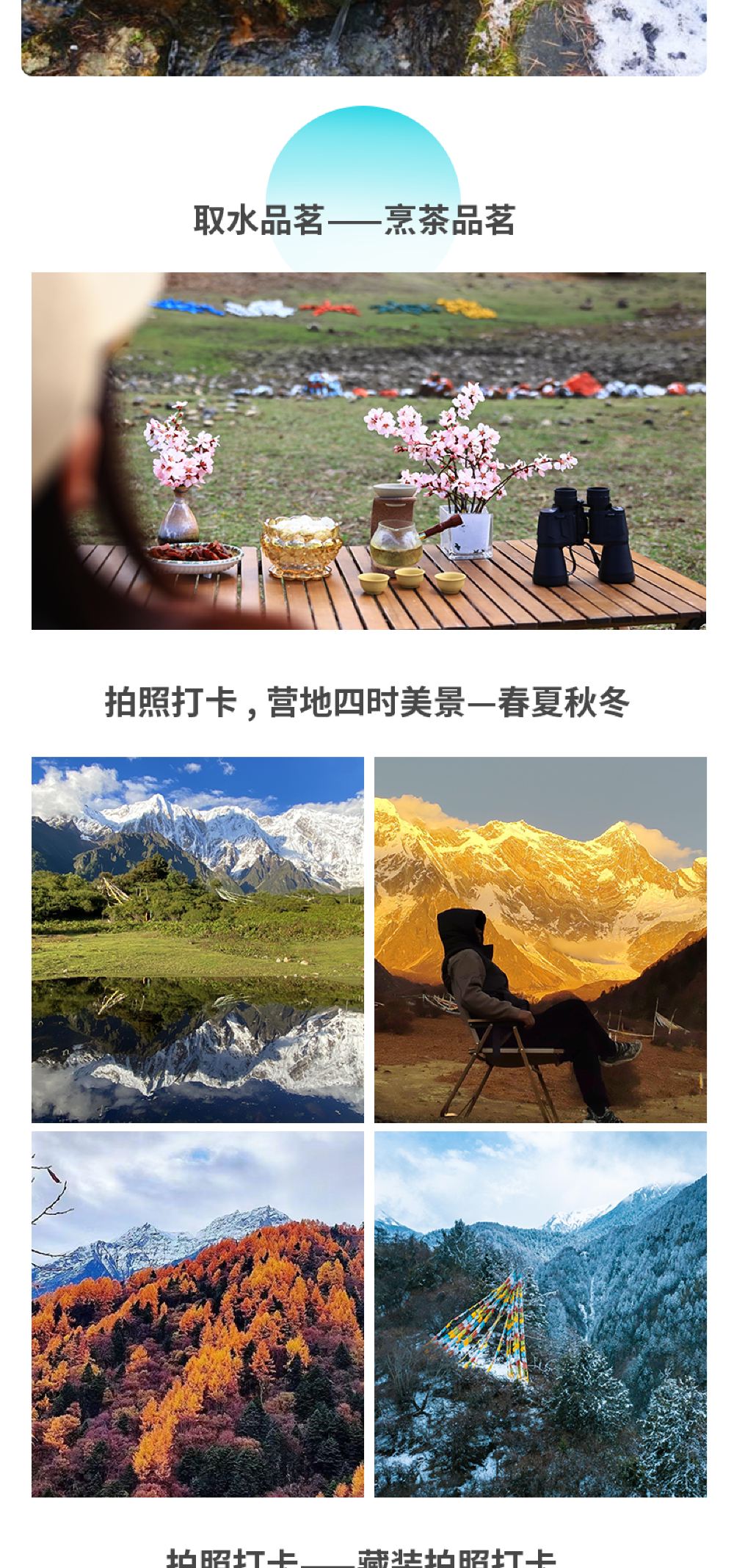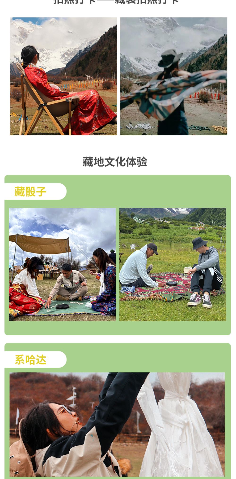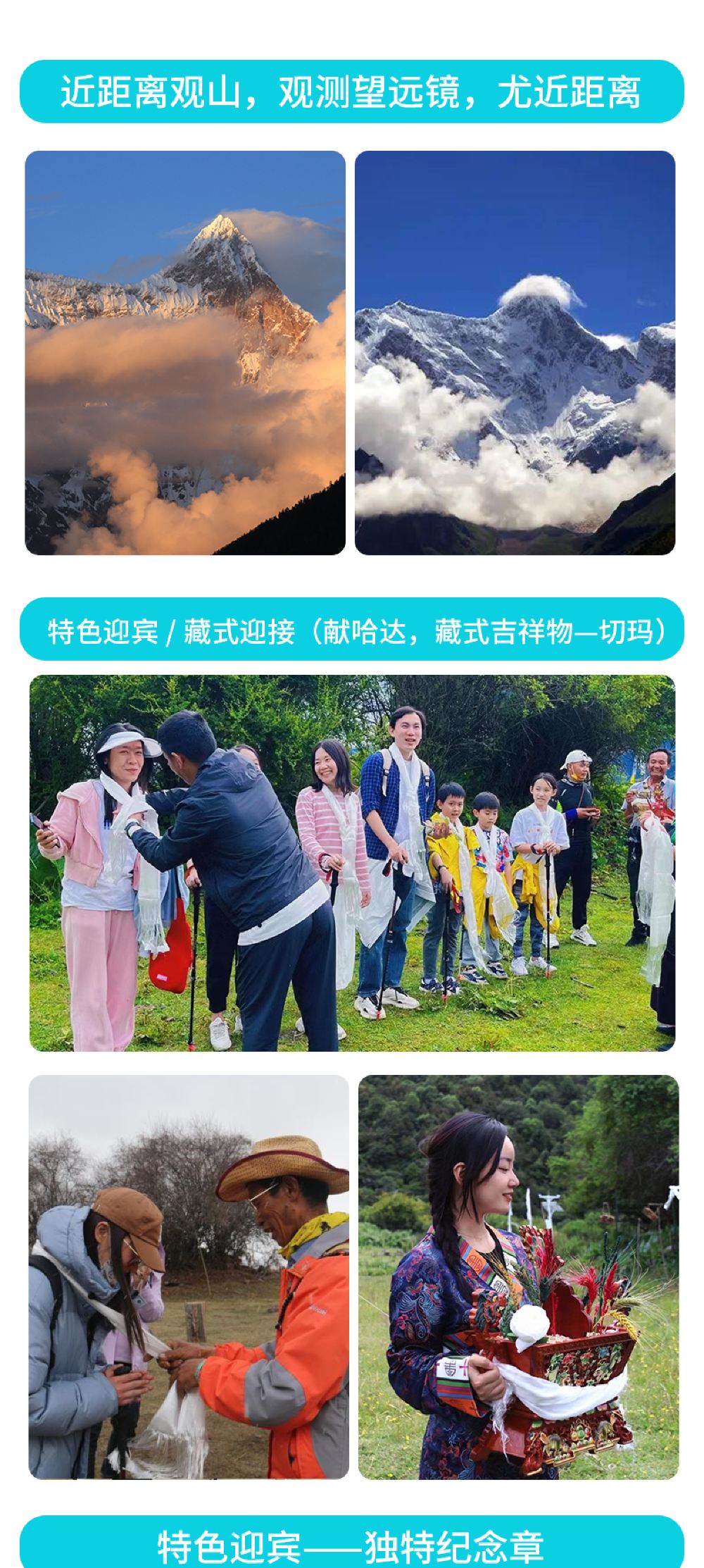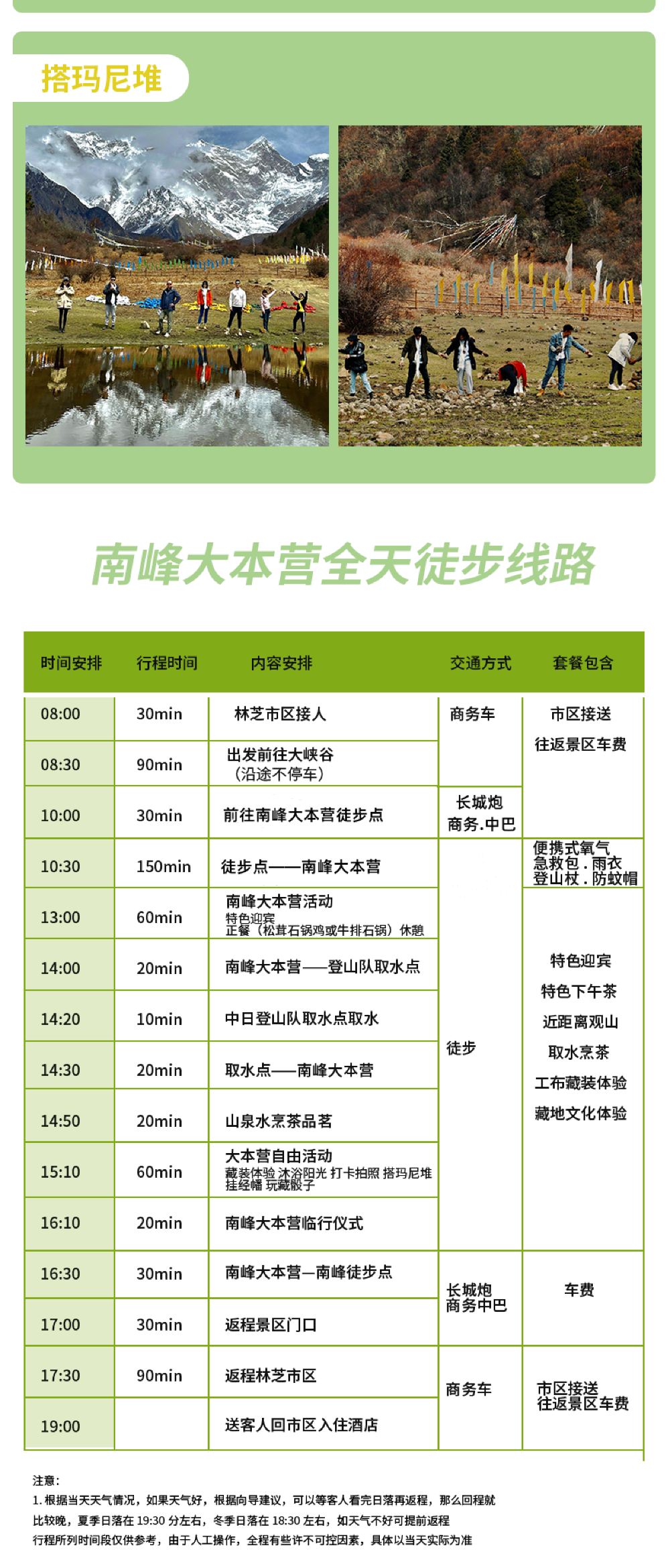 4. 全天和半天套餐体验内容都包含户外工具包(便携式氧气、急救包、雨衣、登山杖、防蚊帽)、特色迎宾、 近距离观山、取水烹茶、工布藏装体验、藏地文化体验 (藏骰子、搭玛尼堆、系哈达等)。