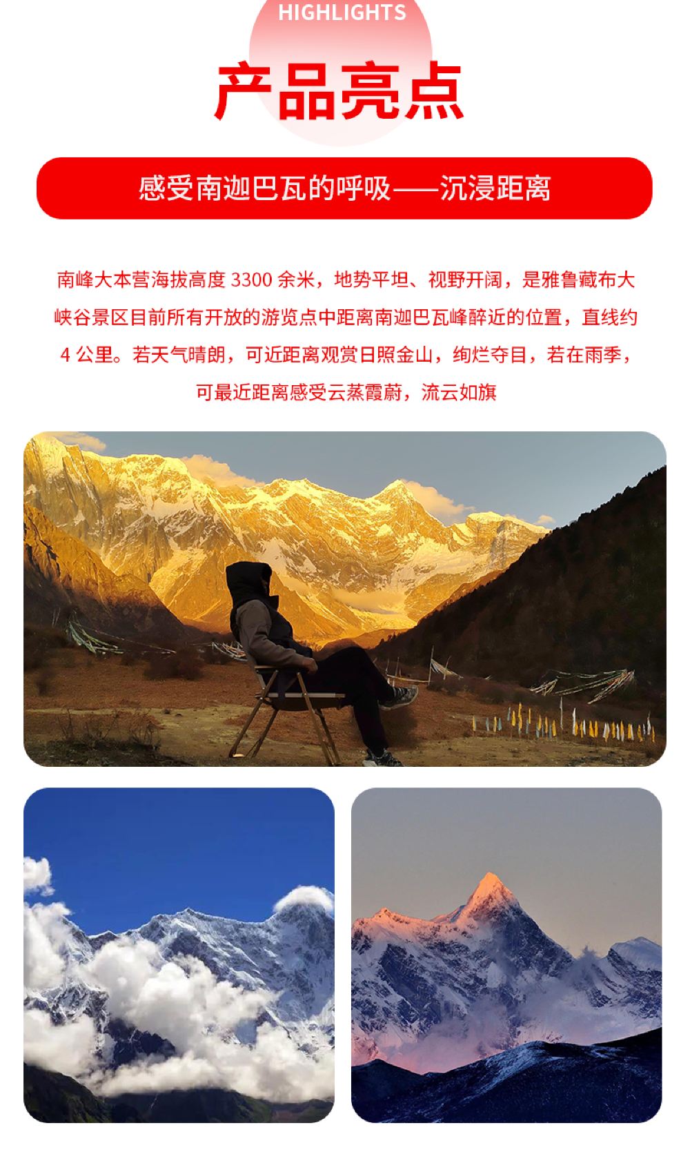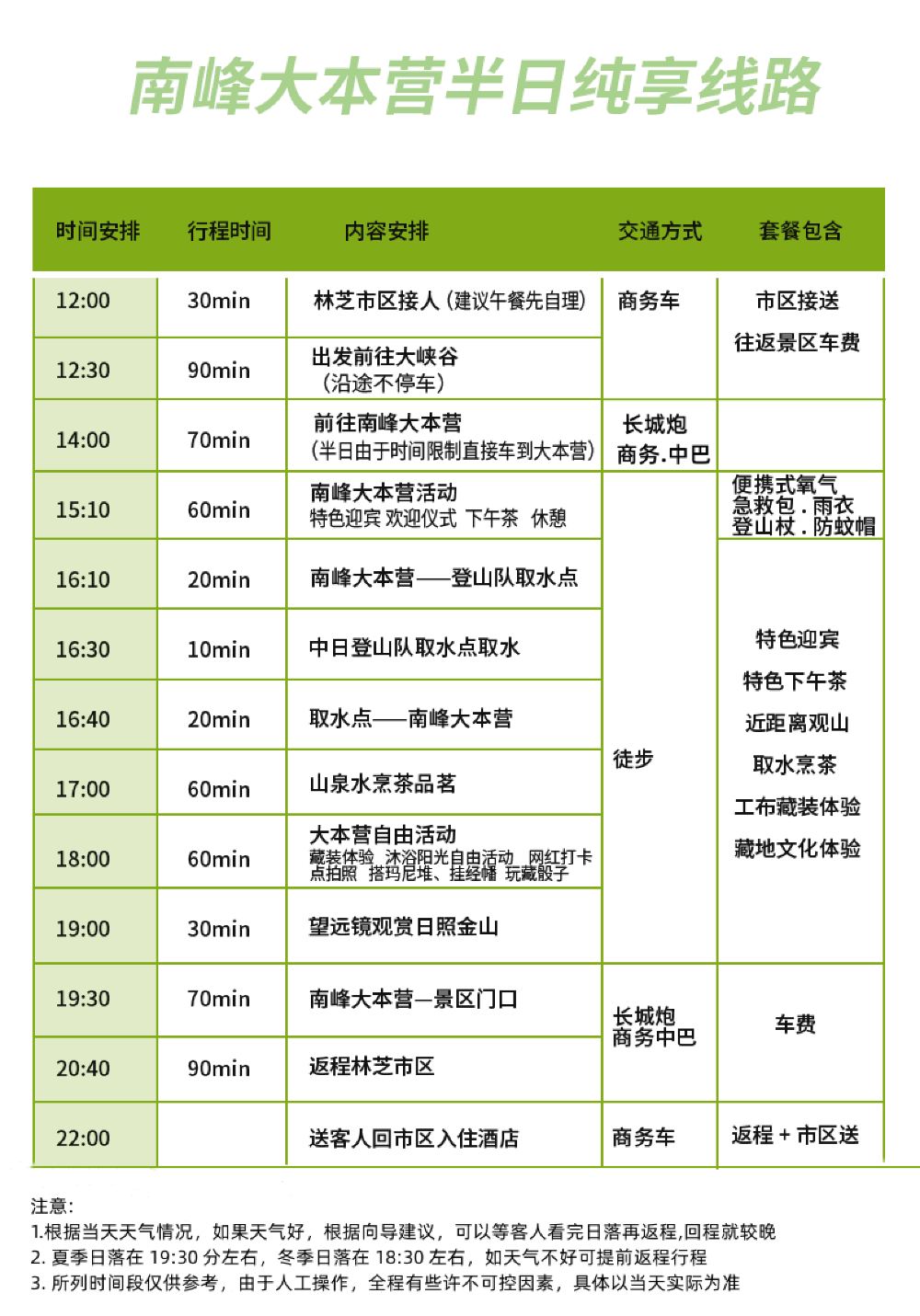 1. 本行程无法赶上回拉萨的火车/汽车,建议订购此行程客人安排第二天其他目的地出行;行程的1 2 3人以上团只针对林芝往返景区阶段,南峰大本营套餐内容人数根据当天景区实际情况而定,敬请知晓!