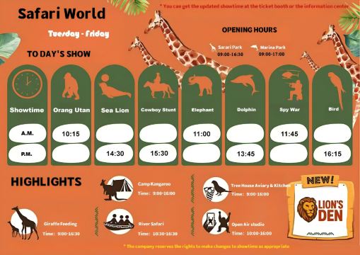 ● 在海洋公园入口处,有每天的表演时刻表,可以拍照留存,请提前抵达表演场地;海洋公园内每天安排很多有趣表演(人猿表演、大象表演、海豚表演、鸟类表演等等.....此外还有泰国民间舞、巴布亚新几内亚土风舞、美国西部牛仔武打等表演,请按照公示牌去观看)
