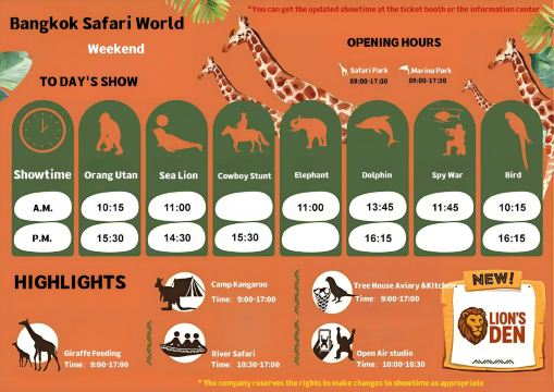 ● 出行当天,司机会按照预约的时间,在您的酒店大堂等待接您,前往Safari World Bangkok,抵达后司机会帮您换票(含餐的客人会一起帮换餐券,请全部保管好,不要丢失)