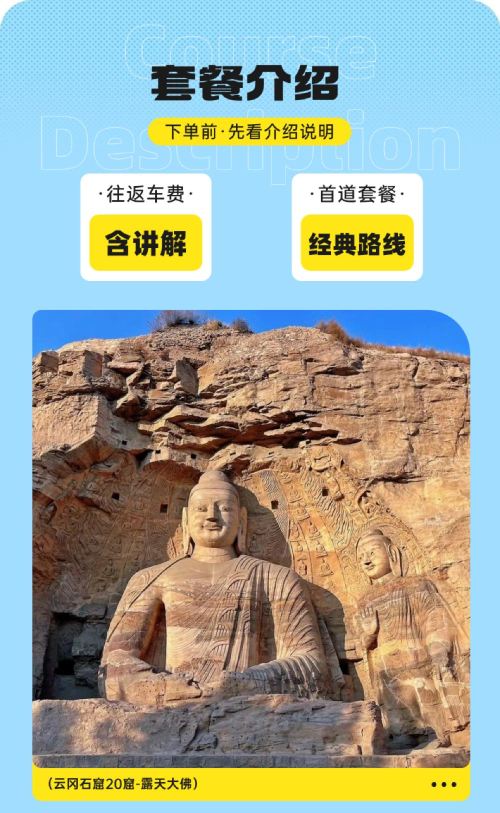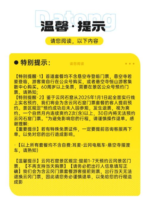 2.【温馨提示】景点采用刷身份证入园,云冈石窟景区门票需提前预约,当天不能预约,请大家提前规划行程。