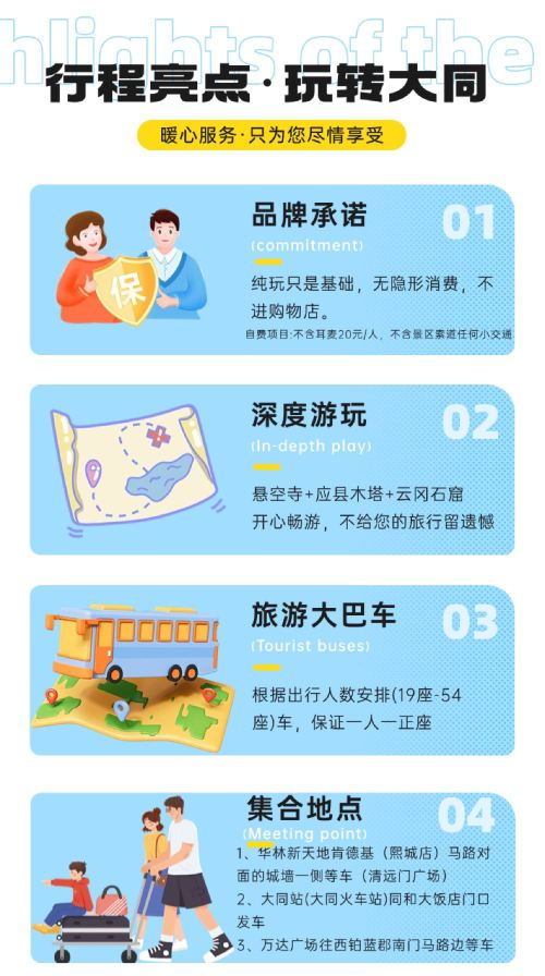 11.参考时间:早上6点左右大同平城区上门接,具体以导游通知为准;导游有权利根据景区淡旺季随时调整出发时间;