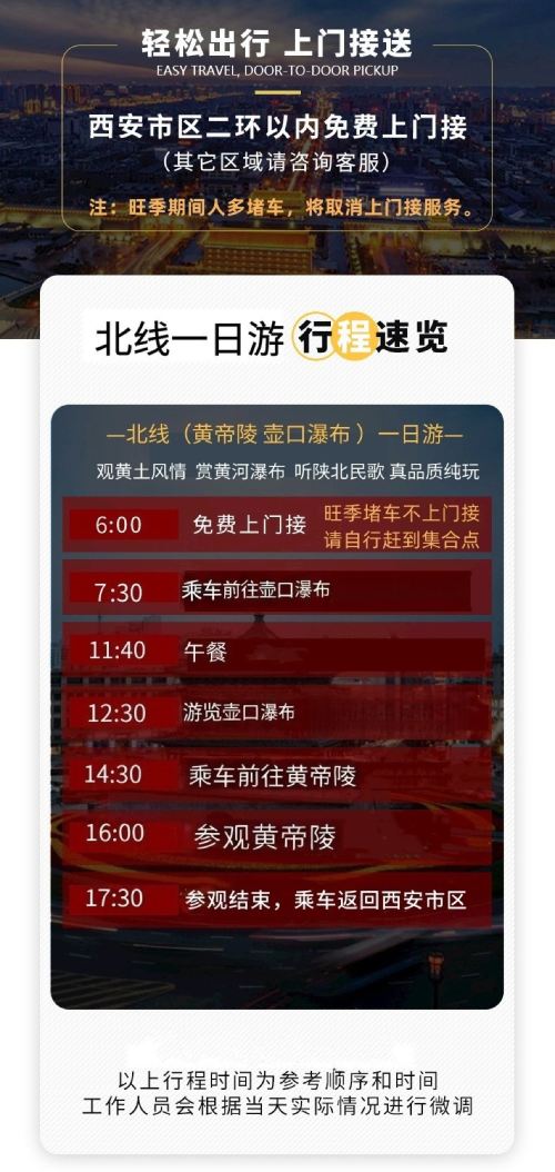 国庆或春节等旺季期间,因为人多堵车,为不耽误大家宝贵的时间,前往壶口的当天,暂时不再提供二环以内上门接的服务,请客人自行到集合点(西华门或者钟鼓楼)集合,具体地址以导游提前一天通知为准。谢谢。