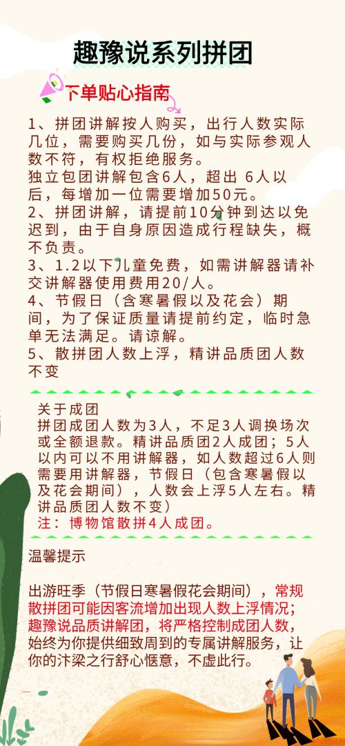 ▲ 温馨提示 出游旺季(节假日寒暑假以及花会期间), 趣豫说品质讲解团,将严格控制成团人数,始终为你提供细致周到的专属讲解服务,让你的汴梁之行舒心惬意,不虚此行。