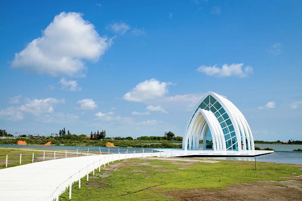 ▲ 「北門水晶教堂」為園區內其中一座藝術建築,也是台灣第一個以婚紗主題設計的白色水晶教堂;一座仿關島海之教會St.LagunaChapel而建的水晶教堂,它優雅的矗立在水中,白色倒影如夢似幻,感受來自異國的浪漫。