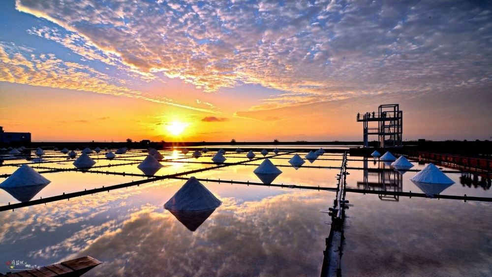 ▲ 「井仔腳瓦盤鹽田」是北門的第一座鹽田,也是現存古老的瓦盤鹽田遺址,原為清領時期的瀨東鹽場,1818年遷此至今未再移位,而且清一色為瓦盤鹽田,呈現出馬賽克拼貼般的美麗藝術,後因人工成本過高的原因,於2002年結束了長達338年的曬鹽業,使原來遍布此處的鹽田荒廢了一段時間,後來為延續鹽業文化而將鹽場復育,現已成為台南濱海具特色的景點。每日夕陽照射在瓦盤鹽田上倒映天空的美麗光彩,搭配北門潟湖一望無際的天際線跟雲彩,讓鹽田邊總是擺滿了攝影腳架,賞景的遊客更是絡繹不絕。