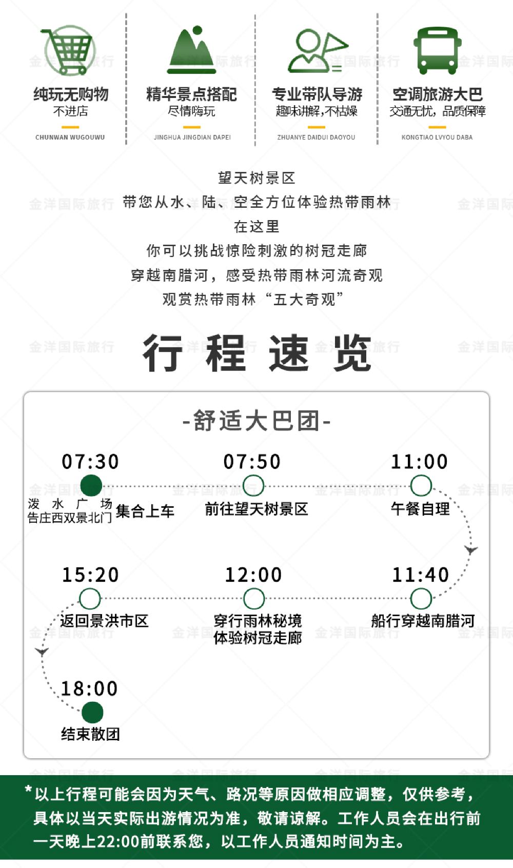 备注: 行程中的游览时间、车程为参考时间,具体以当团导游、师傅及实际情况安排为准!儿童仅含往返车位,产生其他费用需要自理,(1.2米以下儿童不会产生其他费用,1.2-1.4米儿童需自补门票和空中走廊半票以及游船费