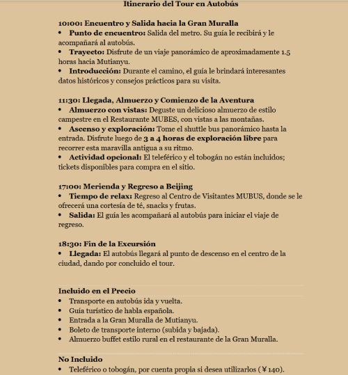 ▲ 发团日期:每天发团 出发时间:10:00 AM 集合地点:东直门地铁C口(地铁2号线,13号线,机场快线均可直达) 价格包含:往返巴士,西班牙语导游,景点门票,摆渡车票,中西自助午餐。 价格不包含:长城缆车(自选) 行程购物:纯玩无购物