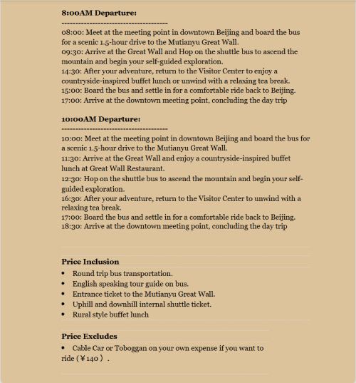 ▲ Mutianyu Great Wall One-Day Bus Tour 产品名称:慕田峪长城一日游(英文团) 产品说明 发团日期:每天发团 发团时间:8:00AM 和 10:00AM 集合地点:东直门地铁B1口(地铁2号线,13号线,机场快线均可直达) 价格包含:往返巴士,英文导游,景点门票,摆渡车票,中西自助午餐。 价格不包含:长城缆车(自选) 行程购物:纯玩无购物
