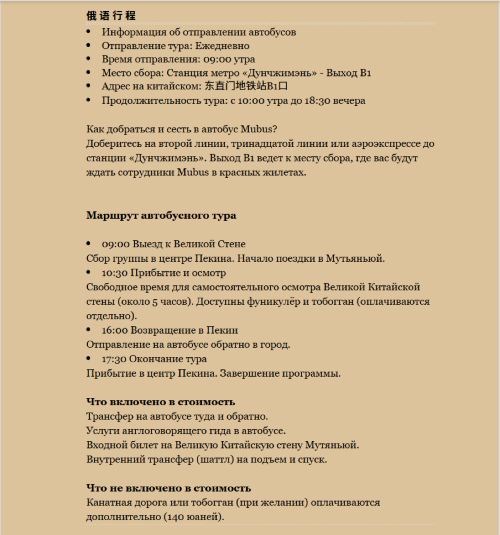 ▲ 慕田峪长城一日游(俄语团) 发团日期:每天发团 发团时间:9:00AM 集合地点:东直门地铁B1口(地铁2号线,13号线,机场快线均可直达) 价格包含:往返巴士,俄语导游,景点门票,摆渡车票,中西自助午餐。 价格不包含:长城缆车(自选) 行程购物:纯玩无购物