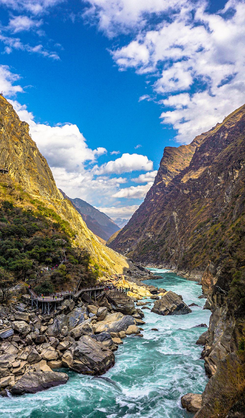 虎跳峡分三段,依次是上中下三段,即上虎跳峡,中虎跳峡,下虎跳峡。虎跳峡位于香格里拉市虎跳峡镇境内,距香格里拉市96公里,距丽江市80公里。发源自青海格拉丹东雪山的金沙江迢迢千里奔波到此,
