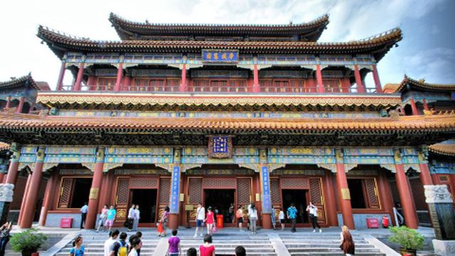 雍和宫(The Lama Temple)位于北京市区东北角,清康熙三十三年(1694年),康熙帝在此建造府邸、赐予四子雍亲王,称雍亲王府。雍正三年(1725年),改王府为行宫,称雍和宫。雍正十三年(1735年),雍正驾崩,曾于此停放灵枢,因此,雍和宫主要殿堂原绿色琉璃瓦改为黄色琉璃瓦。
