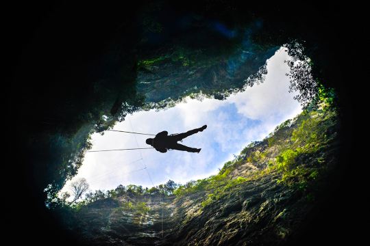 ▲ 猴耳天坑蹦极(也称“超级大秋千”)是位于贵州省贵阳市开阳县的一个极限运动项目,坐落在一个天然形成的喀斯特天坑边缘,坑口直径约300米,深度约280米。这里是地质的“漏斗”,是自然的“巨匠”用亿万年时光雕琢出的杰作。奇府异洞交错纵横,绝壁如画,岩层叠嶂,仿佛在诉说地球深处的古老故事。缓攀600余级天梯,蜿蜒陡峭,扶梯而上,云雾缭绕间,宛如登天入仙,举目仰望,顿生“身在人间,心在仙境”之感。