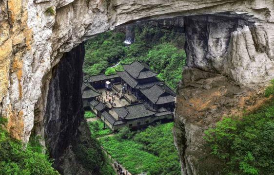▲ 古建群落,坐落于天坑峡谷间,飞檐翘角的古建在苍翠中,烟火气与自然奇观交融