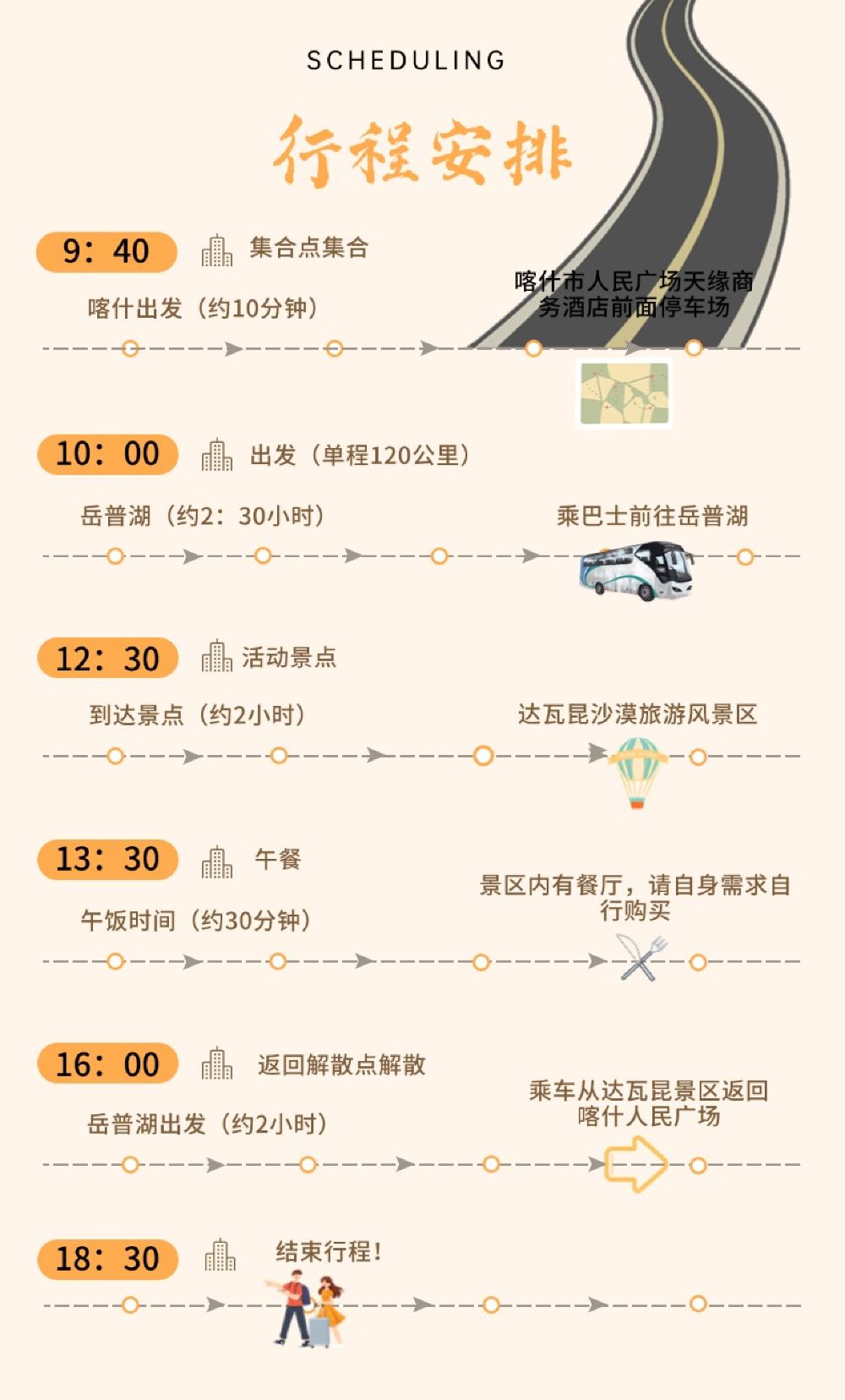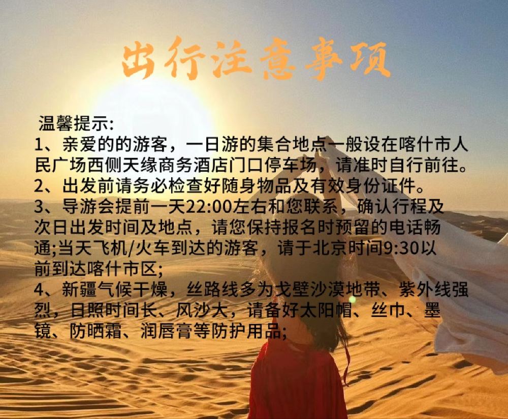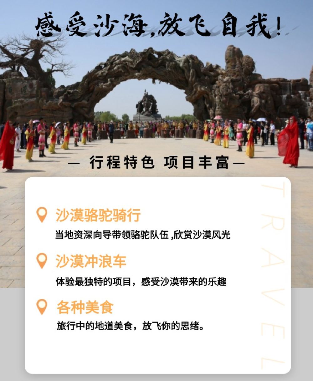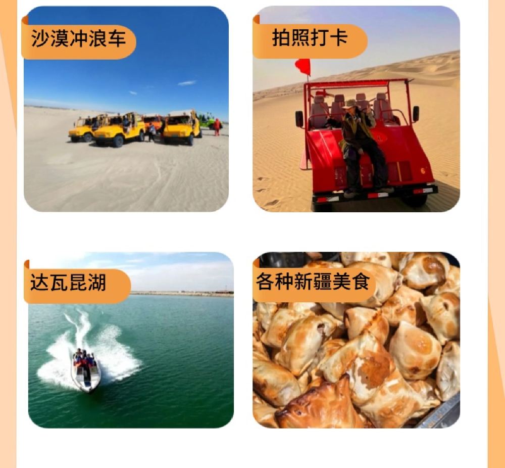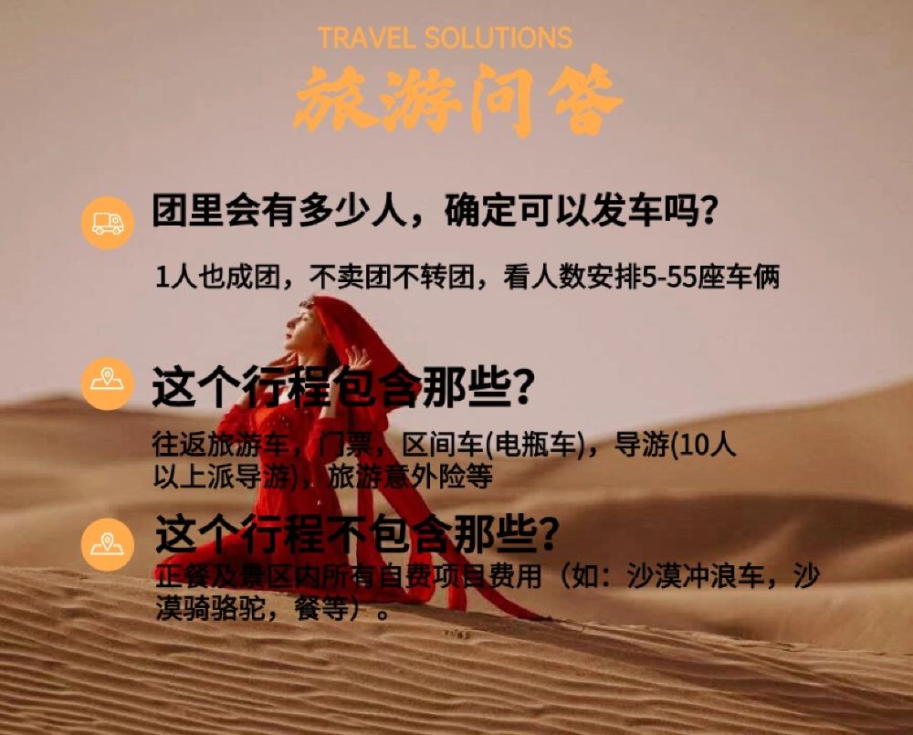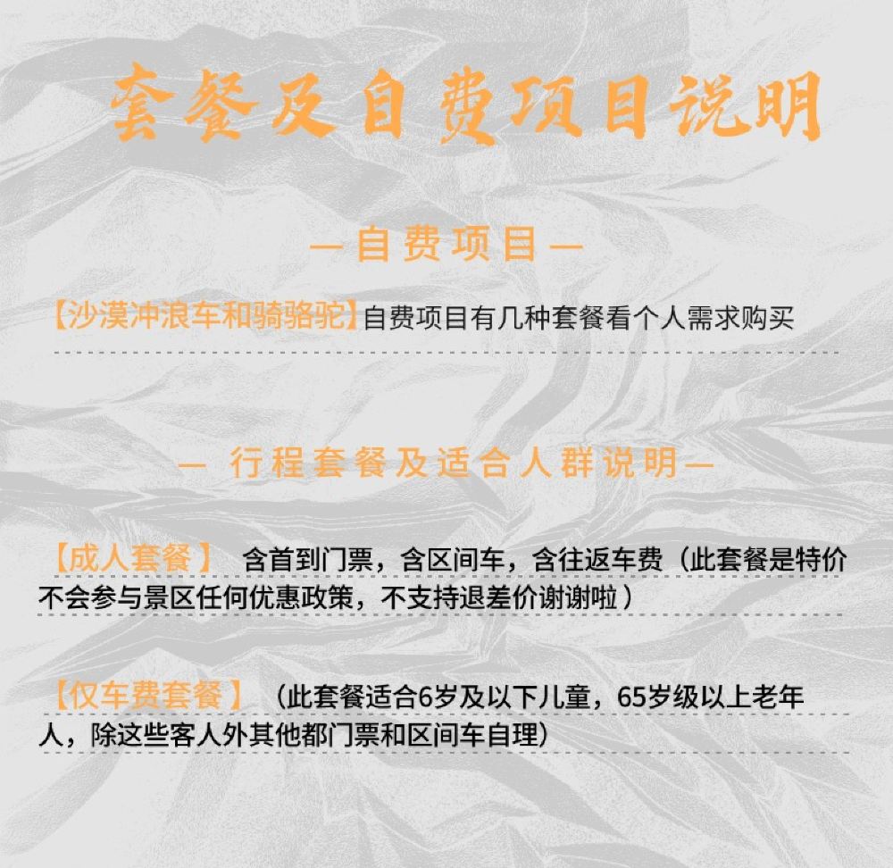 此行程沙漠冲浪车体验和骑骆驼体验的自费项目是客人自愿消费体验,团费不包含景区任何自费项目费用;