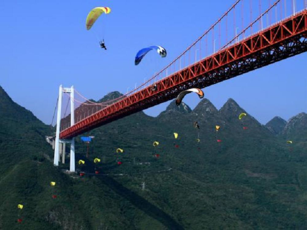 ▲ “世界桥梁看中国,中国桥梁看贵州”。坝陵河大桥,中国贵州省安顺市境内连接东西两岸的高速 通道,位于坝陵河水道之上,是上海—昆明高速公路(国家高速 G60)重要组成部分。坝陵河大桥西起 关岭立交,上跨坝陵河水道,东至 320 国道;线路全长 2237 米,主桥长 1088 米;是世界超级桥梁工 程奇迹,贵州省内首座可进入桥体观光的大桥(360°全景观光)。 2019 年 10 月 1 日,坝陵河大桥蹦极活动对外开放;该蹦极在 2019 年 1 月 12 日刷新了吉尼斯蹦极 世界纪录,高度约 370