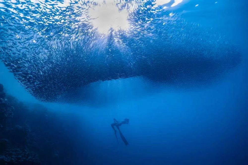 在这里,大人们可以悬崖跳水,看夕阳,探裂缝,樶精彩的是,孩子们在这里还可以看到游动起来、也可以遮天蔽日的沙丁鱼群。在一片温柔蔚蓝的背景下,沙丁鱼球闪烁着黑金般的光亮,如果你冲着一个鱼球游过去,它们会羞怯的躲开,却又并不会马上逃走,而是环绕在你身边,旋转成一个美妙的风眼,这时候,你仿若置身于风暴的中心,却毫无动荡之感,而周遭光影流转,变幻出异次元般的景象。当鱼群快速从自己身边掠过的时候,你能听到它们集体转向时发出的刷刷声,而被鱼群围绕其中时,更是目不暇接,眼花缭乱。